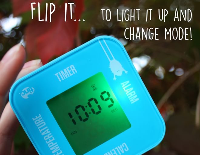 Perfect for lazybones and sleepy-heads, this brilliant digital alarm clock is so simple to use. Just flip it one of four ways to access all of its functions - an alarm clock, a calendar, a thermometer and a timer too. The easy-set alarm has a cool digital beeping sound as well as an adjustable 24/48 hour display. With a fun multicolour backlight, this 7cm alarm clock is an excellent addition to any bedside table. Fun meets functionality - it's about time!