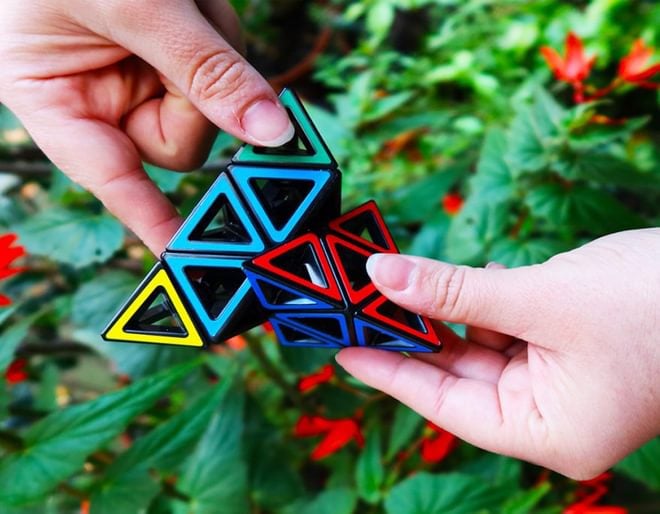 Brain-teasing 3-layered twisty puzzle with hollow pieces, like a triangular Rubik's Cube.