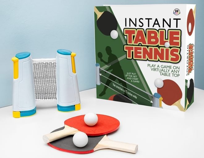 A clever table tennis set that allows you to play the game on virtually any table top.