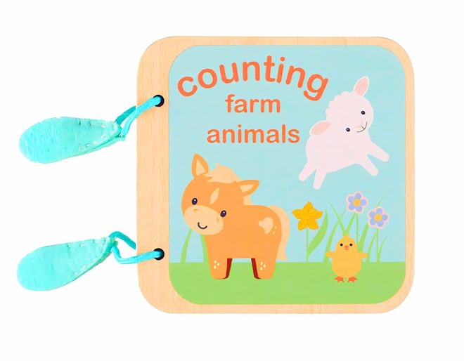Wooden 9cm book with farmyard animals, to help little ones count from 1 to 4.