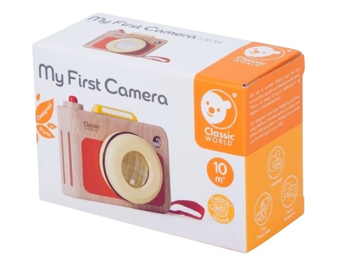 Have fun taking pictures with this adorable pretend camera! Crafted from durable FSC sustainable wood, it has a sturdy and colourful design. It features a rotating lens and an interactive shutter button - perfect to encourage imaginative play. To add to the fun the camera lens is a fascinating kaleidoscope! Lightweight and easy for little hands to hold, with a cool red strap making it great for playtime adventures on the go. Say cheese!