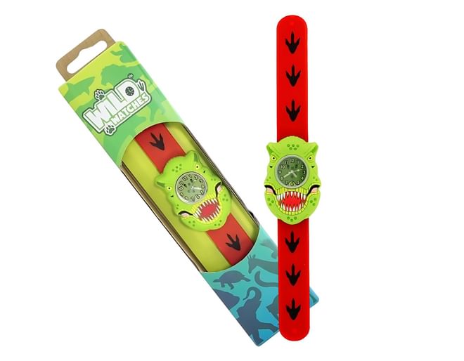 This bright and colourful watch is set within the face of a ferocious T-Rex dinosaur, with the comfortable silicone strap decorated with dino foot prints. With no awkward buckle, just snap on your wrist and the strap smoothly wraps around, sizing to the wearer. The perfect way to make wearing a watch lots of fun and encourage little dino fans into learning to tell the time. Everyone loves a T-Rex!