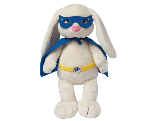 This super soft bunny comes complete with a sewn on superhero mask, cape and belt. Enjoy hours of superhero themed play using your imagination to take bunny on any adventure you can conjure. Featuring ultra-soft plush fabrics with embroidered facial features and weighted in the base, he can sit proudly waiting to save the day. Is it a bird, is it a plane? No . . . It's Superhero Bunny!